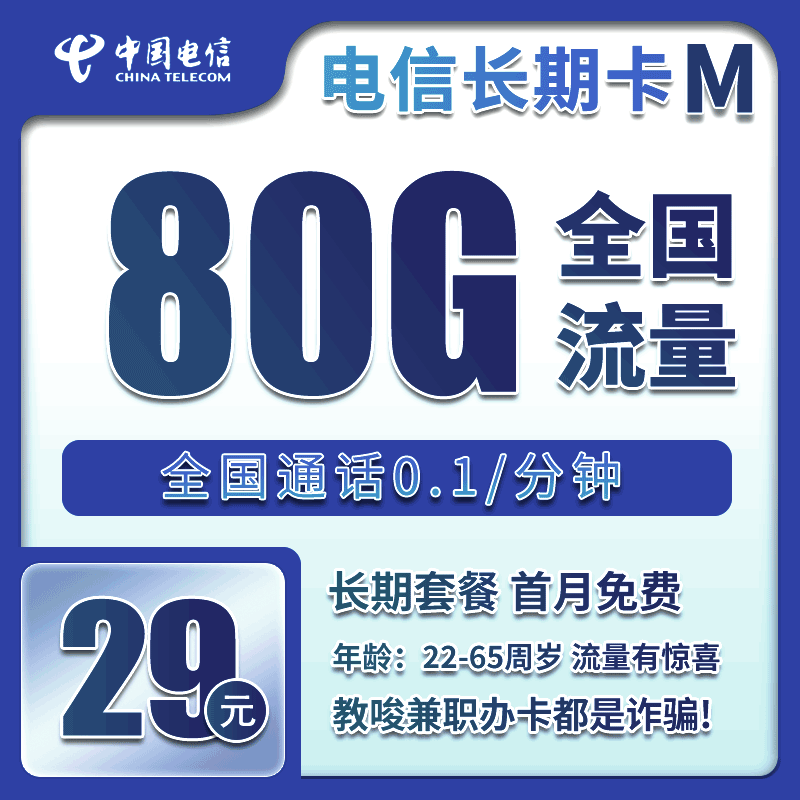 29元包月50G通用+30G定向+通话0.1元/分钟